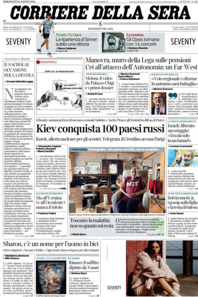 Sui giornali di oggi le notizie in apertura sono diverse: alcuni si occupano dell’andamento della guerra fra Russia e Ucraina, con gli attacchi russi con missili e droni su diverse città ucraine e l’offensiva ucraina nella regione di Kursk, altri seguono la politica italiana, con le discussioni nella maggioranza di governo sulle misure da inserire nella manovra economica e sull’autonomia differenziata. Il Manifesto apre invece sulle consultazioni in Francia per la formazione del nuovo governo e sulla scelta del presidente Macron di non nominare un primo ministro della coalizione di sinistra, il Fatto e il Tempo titolano sui candidati e le alleanze per le prossime elezioni regionali in Liguria, e Domani si occupa della liberazione di un ostaggio israeliano a Gaza.