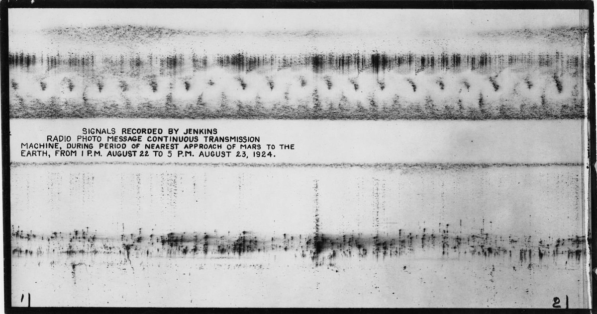 Jenkins insieme ad altri collaboratori aveva infatti costruito una “radio fotocamera” per convertire i segnali radio in impulsi luminosi, che lasciavano poi una traccia su un rullino di carta fotografica. Appena un anno dopo Jenkins avrebbe ottenuto uno dei primissimi brevetti per la trasmissione di immagini e suoni in contemporanea, diventando uno dei pionieri della televisione, ma in quell’estate del 1924 la sua “radio fotocamera” era ancora rudimentale e soprattutto non era detto che i marziani volessero trasmettere qualche immagine.