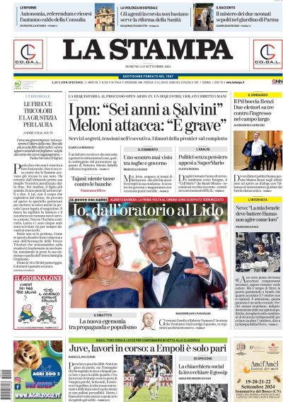 Praticamente tutti i quotidiani hanno in apertura la richiesta della procura di Palermo di condanna a 6 anni di carcere per Matteo Salvini per avere impedito, cinque anni fa, lo sbarco della Open Arms a Lampedusa, e molti anche le parole della presidente del Consiglio Giorgia Meloni in sua difesa. Il Corriere della Sera ha in apertura anche lo scambio di prigionieri tra Russia e Ucraina di sabato pomeriggio. Gli sportivi si concentrano sulla vittoria di ieri sera del Milan per 4 a 0 contro il Venezia, e sul pareggio tra Empoli e Juve.