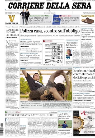 Sulle prime pagine dei principali quotidiani di oggi trova spazio una discussione in corso nel governo sulla proposta di rendere obbligatoria, quantomeno per le imprese, l’assicurazione contro i disastri naturali. All’interno della maggioranza, secondo diversi giornali, le posizioni sono varie: la Lega sarebbe contraria. Un’altra notizia riportata in prima pagina da diversi quotidiani è l’indagine della procura di Roma su Maria Rosaria Boccia, accusata di lesioni e violazione della privacy nei confronti dell’ex ministro della Cultura, Gennaro Sangiuliano.