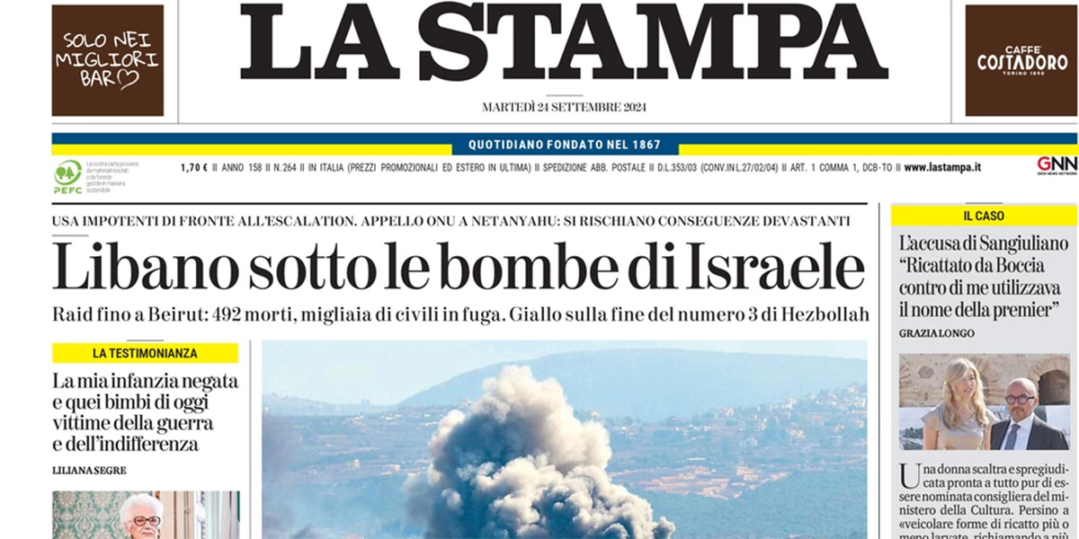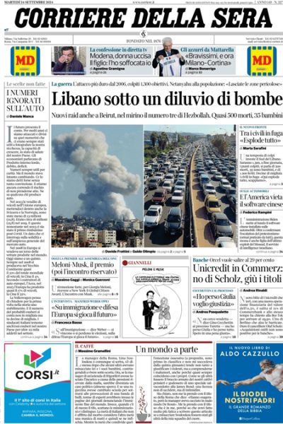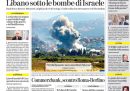 La notizia principale su cui apre la maggior parte dei giornali di oggi sono i bombardamenti dell’esercito israeliano contro le postazioni di Hezbollah in Libano, che hanno provocato quasi 500 morti fra i quali molti civili. Qualche giornale titola invece sull’operazione con cui Unicredit vuole acquisire il 29,9 per cento della banca tedesca Commerzbank, operazione a cui è contrario il governo tedesco, il Fatto si occupa dell’aggiornamento dei dati dell’ISTAT sull’economia italiana degli ultimi anni, e Libero apre sugli ascolti del nuovo programma presentato da Amadeus su Discovery.