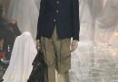 Anche la sfilata di domenica era una cosiddetta co-ed, presentava cioè sia la collezione da donna sia da uomo in 85 look molto ispirati agli archivi di Valentino, in particolare a quelli dalla fine degli anni Sessanta a inizio anni Ottanta. C’erano tanti elementi riconoscibili dell’azienda – l’utilizzo di stampe a fiori, volant, fantasie paisley, ricami, pois, perle, turbanti, pellicce (ecologiche), grandi cappelli, pizzi, molto rosso e bianco – aggiornati nelle linee e soprattutto nello styling, il modo di indossare capi e accessori e di abbinarli tra loro: da sempre uno dei punti di forza di Michele. Per esempio i look da uomo riprendevano lo stile di vestire di Valentino Garavani, il fondatore dell’azienda, con pantaloni a zampa, grandi occhiali, giacche blu, cardigan stretti in vita da una cintura, foulard, ma attualizzati e abbinati a ballerine, collane di perle e una specie di foulard-cravatta.