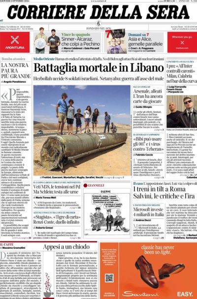 La maggior parte dei giornali di oggi dedica l’apertura alle notizie provenienti dal Medio Oriente: l’attesa per la reazione israeliana all’intenso lancio di missili sul suo territorio da parte dell’Iran e i combattimenti in Libano fra Hezbollah e Israele nei quali ieri sono morti otto soldati israeliani. Repubblica e il Giornale aprono invece sul guasto alla rete elettrica che ha bloccato per due ore la circolazione dei treni nelle stazioni di Roma Termini e Tiburtina, con gravi ripercussioni sulle ferrovie di tutta Italia, Libero titola sui dati diffusi da un sindacato sull’occupazione e la produzione dell’azienda Stellantis, e i giornali sportivi commentano i risultati delle squadre italiane in Champions League, con le vittorie di Juventus e Atalanta e la sconfitta del Bologna.