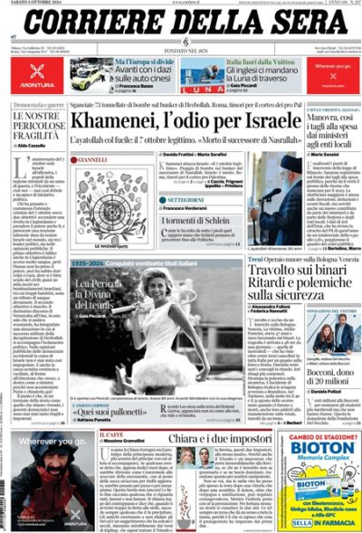 Le notizie principali su cui aprono i giornali di oggi sono le discussioni nella maggioranza di governo sui contenuti della legge di bilancio dopo le dichiarazioni del ministro dell’Economia Giorgetti che ha ipotizzato nuove tasse per le imprese, e il discorso dell’ayatollah Khamenei, guida suprema dell’Iran, durante la preghiera del venerdì nel quale ha ricordato il leader di Hezbollah Nasrallah e minacciato nuovi attacchi a Israele. Il Manifesto si occupa invece della morte di un operaio travolto da un treno vicino a Bologna mentre lavorava sulla linea ferroviaria, mentre Libero e il Tempo titolano sulla manifestazione di oggi a Roma per la Palestina vietata dalla questura.