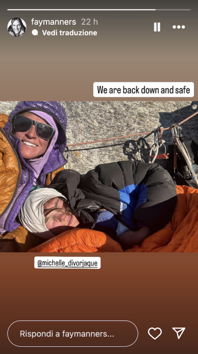 Manners ha raccontato a BBC che, quando la frana ha rotto la corda, ha visto «la borsa rotolare giù per la montagna» e ha capito subito quali sarebbero state le conseguenze. «Non avevamo più la nostra attrezzatura di sicurezza, nessuna tenda, nessun fornello per sciogliere la neve, nessun vestito caldo per la sera». Per riuscire a mettere da parte dell’acqua potabile, lei e Dvorak hanno dovuto far sciogliere del ghiaccio.