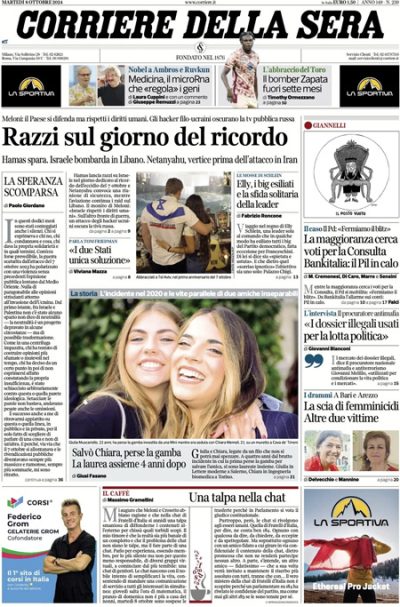 La maggior parte dei giornali di oggi apre sul primo anniversario degli attacchi di Hamas contro Israele in cui furono uccise 1.200 persone e circa 250 vennero prese in ostaggio, passato fra le manifestazioni dei familiari degli ostaggi e il lancio di missili verso il territorio israeliano da parte di Hamas, Hezbollah e dallo Yemen. Repubblica e il Resto del Carlino titolano invece sulla revisione delle stime della Banca d’Italia sul PIL e sulle conseguenze sui conti pubblici, Libero critica l’ipotesi avanzata dalla CGIL di uno sciopero contro la manovra economica a cui sta lavorando il governo, e il Fatto continua la sua campagna contro le norme che limitano l’utilizzo delle intercettazioni nelle indagini giudiziarie.