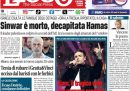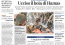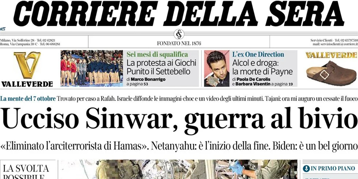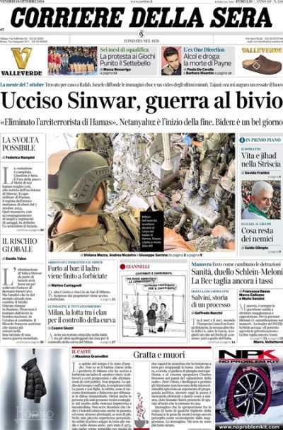 Quasi tutti i giornali di oggi dedicano l’apertura alla morte di Yahya Sinwar, il capo di Hamas responsabile degli attacchi del 7 ottobre 2023, ucciso ieri in un’operazione militare dell’esercito israeliano nel sud della Striscia di Gaza. Qualche giornale rimane invece sui contenuti della prossima legge di bilancio, altri si occupano delle discussioni fra i paesi dell’Unione Europea sulla costruzione di centri per migranti fuori dal loro territorio sul modello di quelli costruiti dall’Italia in Albania, e il Manifesto apre sull’annuncio di uno sciopero dei lavoratori dell’industria automobilistica.