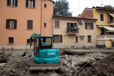 Sono passati un paio di giorni, ma i danni provocati dall’alluvione sono estesi e sono ancora in corso i lavori e le attività di volontariato per porvi rimedio. La zona più danneggiata è via Andrea Costa, una lunga via nella zona ovest di Bologna che collega il centro al quartiere Saragozza e allo stadio. Soprattutto nella parte più a ovest, l’alluvione ha trasformato la strada in una distesa di fango, cancelli sfondati dall’acqua e rifiuti ammucchiati: materassi, sacchi, mobili e cassapanche e mucchi di libri.