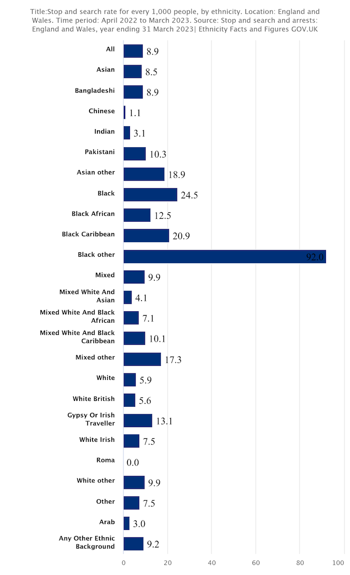 Questo per esempio è un grafico che mostra il numero di perquisizioni ogni 1.000 persone avvenute fra aprile del 2022 e marzo del 2023, divise per etnia. Le perquisizioni nei confronti di persone nere sono state 24,5 ogni 1.000, mentre nei confronti di quelle bianche 5,9 ogni 1.000 (il grafico è un po’ sballato dalla categoria di persone nere che non appartiene uno specifico gruppo etnico, come le persone di origine africana o caraibica).