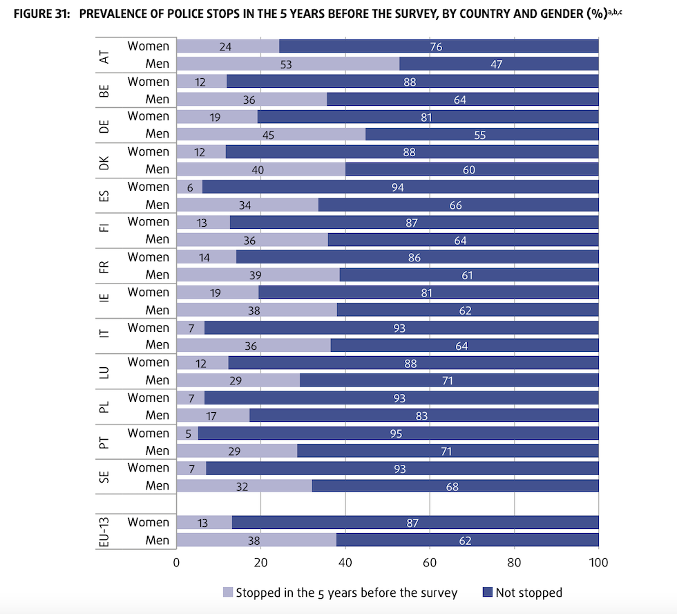 In totale il 26 per cento delle persone intervistate, circa una su quattro, ha raccontato di essere stata fermata dalle forze dell’ordine almeno una volta nei cinque anni precedenti al rapporto. Scorporando il dato per genere, hanno raccontato di essere stati fermati il 13 per cento delle donne e il 38 per cento degli uomini. In Italia il dato è leggermente migliore rispetto alla media europea: hanno raccontato di essere stati fermati il 7 per cento delle donne e il 36 per cento degli uomini.