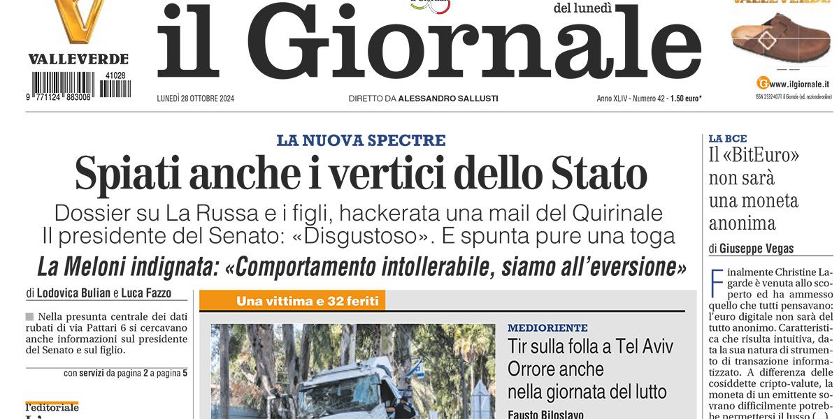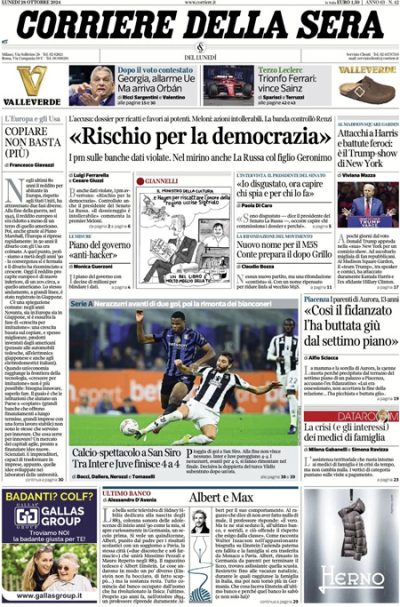 Tutti i giornali di oggi si occupano in apertura dell’inchiesta della procura di Milano sugli accessi illegali alle banche dati dello Stato da parte di un gruppo di persone e aziende accusate di associazione a delinquere finalizzata all’accesso abusivo a sistemi informatici; l’obiettivo degli accusati sarebbe stato quello di raccogliere informazioni su persone famose del mondo delle imprese e della politica per poi venderle. I giornali sportivi dividono le loro attenzioni fra il pareggio per 4-4 fra Inter e Juventus in Serie A e la vittoria della Ferrari di Sainz nel Gran Premio di Formula 1 del Messico.
