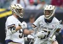 Un disegno del pittore George Catlin che rappresenta tre nativi nordamericani che giocano a baggataway, l’antenato del lacrosse (Wikimedia)