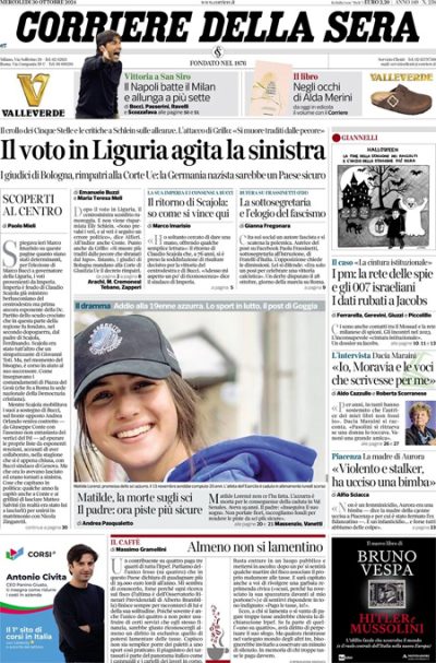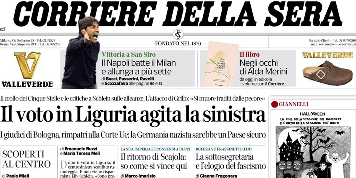 Ci sono notizie diverse in apertura sui giornali di oggi: alcuni si occupano del voto per le elezioni regionali in Liguria, vinte dal candidato di centrodestra Bucci, e delle conseguenze della sconfitta sull’alleanza fra Partito Democratico e Movimento 5 Stelle nel centrosinistra, altri titolano sulla richiesta del tribunale di Bologna alla Corte di Giustizia dell’Unione Europea di un parere sulla legittimità dell’ultimo decreto del governo italiano sui “paesi sicuri” di provenienza delle persone migranti, altri ancora seguono le notizie sull’indagine della procura di Milano sugli accessi illegali alle banche dati per raccogliere informazioni su politici, imprenditori e persone famose. Il Sole 24 Ore analizza i dati delle dichiarazioni dei redditi degli italiani, mentre i giornali sportivi commentano la vittoria sul Milan del Napoli, che rafforza la sua posizione in testa alla classifica di Serie A.