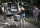 Nel bagagliaio sono impilati uno sull’altro trasportini vuoti per animali di diverse dimensioni che a ogni scossa urtano tra di loro. Con noi sul furgone c’è Cristina, che ha 27 anni ed è specializzata in pratiche di primo soccorso veterinario. Dai finestrini abbassati arriva intenso l’odore di bruciato e polvere da sparo, non ci sono palazzi attorno e le strade si snodano sconnesse all’interno di piccoli quartieri di dacie, le tipiche case di campagna ucraine. La linea del fronte russo-ucraino si trova a circa dieci chilometri e il rumore del furgone sull’asfalto dissestato è intervallato dall’eco sorda delle esplosioni all’orizzonte.