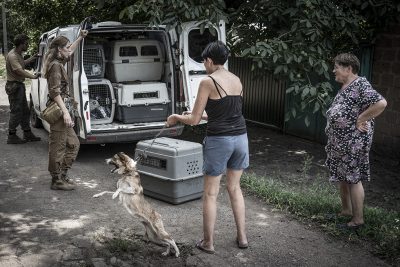 Quando raggiungiamo Druzhkivka, a quaranta chilometri da Toretsk in direzione ovest, è già pomeriggio inoltrato. Ci fermiamo in uno spiazzo sterrato dove altri volontari del posto sono venuti per prelevare alcuni degli animali. Cristina sta valutando le generali condizioni di salute di ognuno. Alcuni hanno delle infezioni purtroppo, verranno messi in quarantena e curati. Delle famiglie che avevano mandato una segnalazione, diverse hanno già riconosciuto il loro cane attraverso le foto. Gli altri saranno dati in adozione o troveranno ospitalità in un canile o un gattile attrezzato.