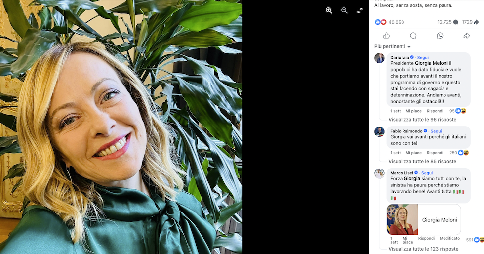 È un esempio tra i moltissimi possibili, basta consultare la pagina Facebook di Meloni per accorgersi della dimensione del fenomeno. Il 21 ottobre, sotto a un suo post che rivendicava l’impegno del governo con un breve messaggio e un selfie che la mostrava sorridente, è comparsa la consueta fila di parlamentari e dirigenti del suo partito. «La sinistra ha paura perché finalmente c’è chi lavora per il solo interesse della Nazione e loro non sono abituati», commenta Galeazzo Bignami, viceministro dei Trasporti. «Siamo orgogliosi di essere rappresentati finalmente da un Presidente che finalmente ama l’Italia. Siamo con te Giorgia non fermarti!», dice il commento di Domenico Damascelli, consigliere comunale pugliese.
