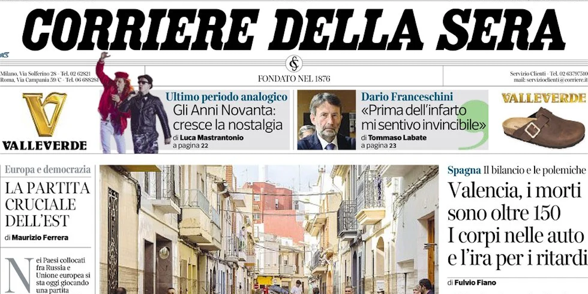 Nella gran parte dei quotidiani la notizia principale in prima pagina sono le alluvioni in Spagna, che hanno provocato almeno 158 morti: occupa soprattutto lo spazio della fotonotizia. Alcuni, come Repubblica e La Stampa, hanno in prima pagina anche la cosiddetta Giornata del risparmio, organizzata dall’ACRI (Associazione di fondazioni e di casse di risparmio), in cui il presidente dell’Associazione bancaria italiana ha detto che i risparmi degli italiani sono troppo tassati. Tra le altre notizie ci sono ancora l’inchiesta sui dati rubati, e sul Messaggero la storia della coppia di uomini italiani che ha avuto un bambina con gestazione per altri ed è stata bloccata in Argentina.