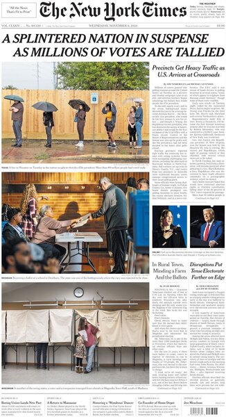 La maggior parte dei quotidiani, negli Stati Uniti come altrove, hanno però chiuso il processo di impaginazione del numero cartaceo di mercoledì prima che si capisse bene in che direzione stava andando l’elezione: per questo, la maggior parte dei titoli è molto vaga e fa semplicemente riferimento al fatto che l’elettorato statunitense fosse pressoché spaccato a metà tra i due candidati.