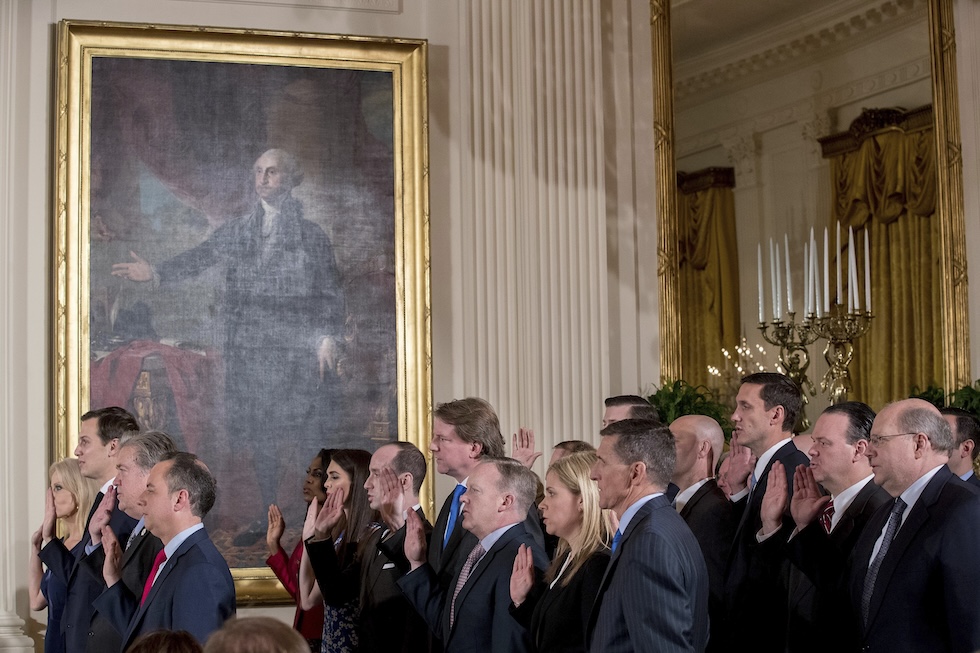 Il giuramento di alcuni membri dello staff di Donald Trump nel 2017 (AP Photo/Andrew Harnik)