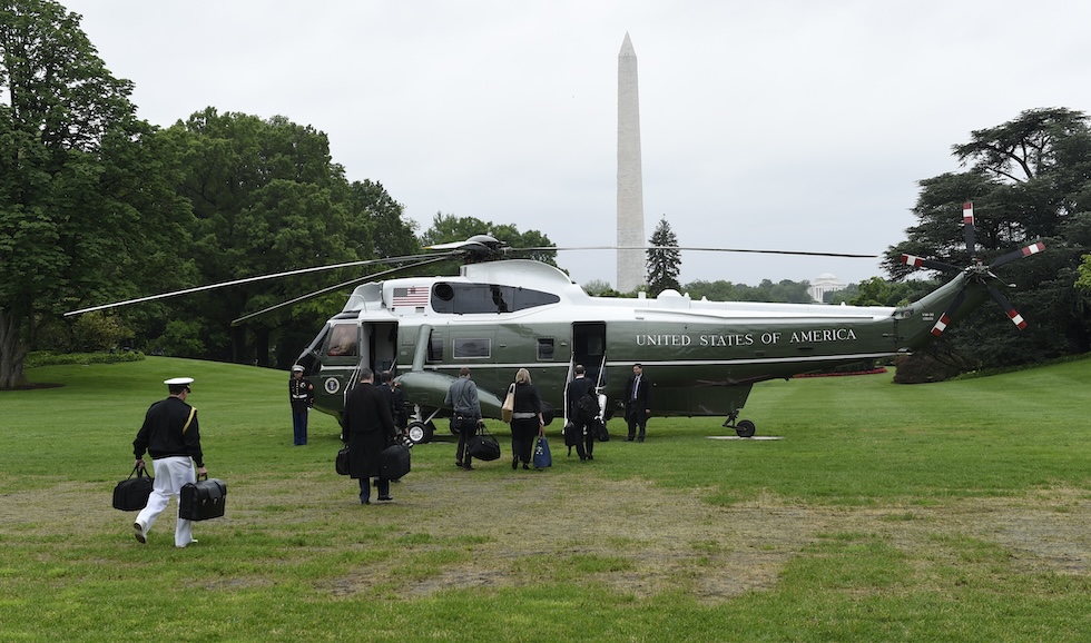Il presidente Barack Obama e parte del suo staff salgono su uno degli elicotteri presidenziali nel 2016 (AP Photo/Susan Walsh)