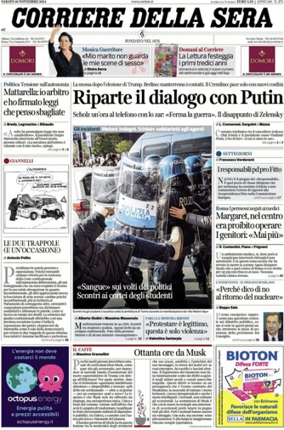 I giornali di oggi dedicano l’apertura a notizie diverse: alcuni titolano sulle parole del presidente della Repubblica Mattarella, che in un incontro con gli studenti ha precisato i limiti del suo incarico riguardo all’approvazione delle leggi, altri aprono sulle manifestazioni di studenti di ieri in varie città e sugli scontri con la polizia che ci sono stati a Torino, altri ancora si occupano della telefonata fra il cancelliere tedesco Scholz e il presidente russo Putin per cercare una soluzione diplomatica alla guerra fra Russia e Ucraina. Le altre notizie principali sulle prime pagine sono le discussioni sulla legge sull’autonomia differenziata dopo la decisione della Corte costituzionale sul testo, le nomine del neoeletto presidente degli Stati Uniti Trump, e le elezioni regionali in programma domani e lunedì in Emilia-Romagna e in Umbria.