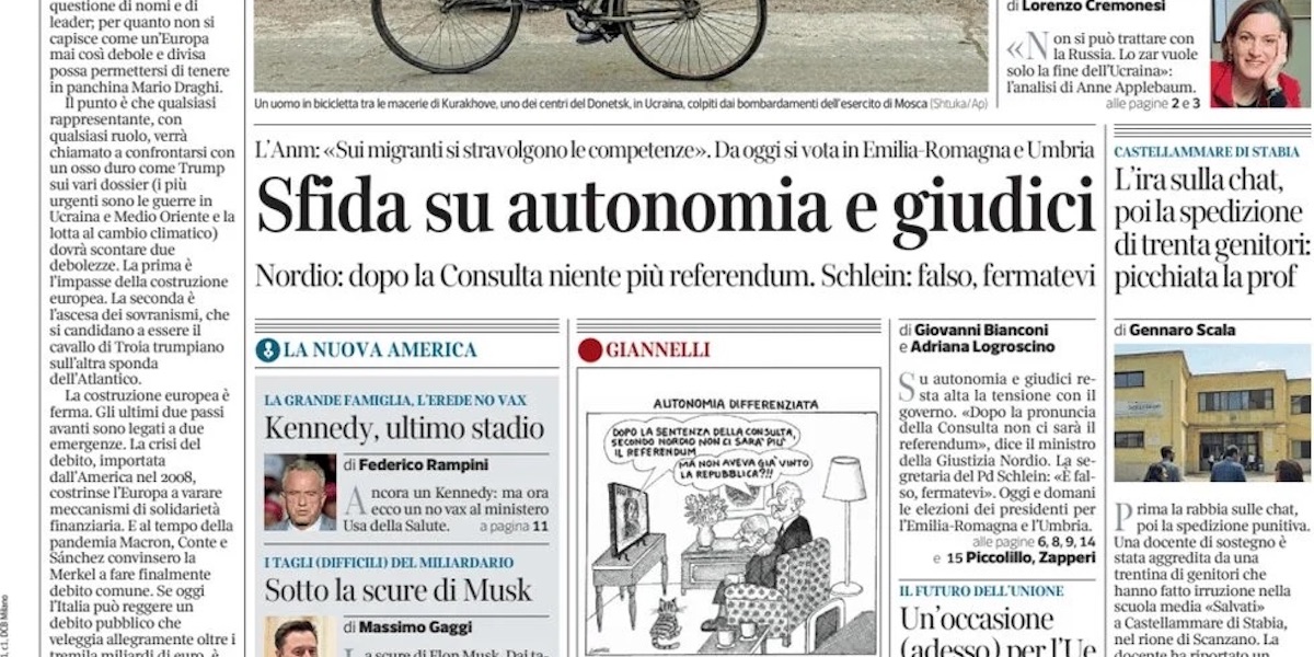 Su molte prime pagine di oggi c’è il commento del ministro della Giustizia Carlo Nordio alla sentenza con cui la Corte costituzionale ha dichiarato parzialmente illegittima la riforma dell’autonomia differenziata. Si parla anche di Gaza, delle elezioni regionali in Umbria e in Emilia-Romagna e della legge che rende la gestazione per altri “reato universale”, che da lunedì 18 novembre sarà pubblicata nella Gazzetta ufficiale. L’apertura dei quotidiani sportivi invece è dedicata al tennista Jannik Sinner, che ha vinto contro il norvegese Casper Ruud e si è qualificato per la finale delle ATP Finals, il torneo che si sta giocando a Torino in cui si affrontano gli otto migliori tennisti della stagione.