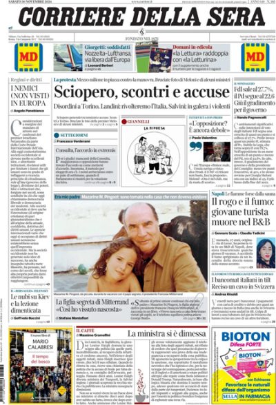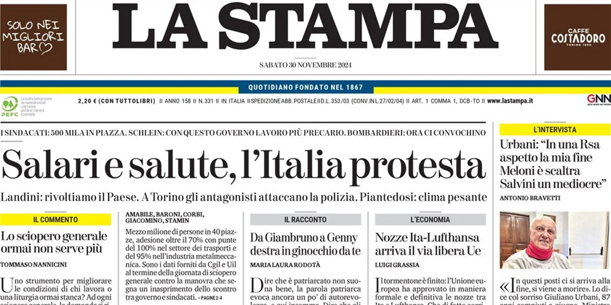 Lo sciopero generale di ieri è la notizia in apertura su quasi tutti i giornali di oggi, con valutazioni diverse sulla partecipazione dei lavoratori e sulla gravità degli scontri con la polizia durante la manifestazione che si è svolta a Torino. Repubblica e il Dubbio aprono invece sul decreto-legge sulla giustizia approvato ieri dal Consiglio dei ministri con alcune novità, Avvenire intervista il presidente palestinese Abu Mazen, il Sole 24 Ore e il Mattino titolano sull’andamento delle opere previste dal PNRR, e il Fatto critica il governo per il ritardo nell’approvazione del piano pandemico.