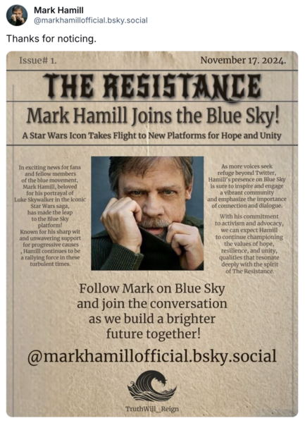 Sulla questione si sono espresse anche varie celebrità. Uno dei primi post pubblicati su Bluesky dall’imprenditore miliardario Mark Cuban, per esempio, è stato: «Ciao, mondo meno odioso». La rapper Lizzo ha scritto di essere passata da X a Bluesky «per lasciare la tossicità», e da allora è molto attiva sul nuovo social. Mark Hamill, attore noto per il ruolo di Luke Skywalker nella saga di Star Wars, ha pubblicato una finta locandina che annuncia: «Mark Hamill si è unito a Bluesky! L’icona si rifugia sulla nuova piattaforma in cerca di speranza e unità». Anche lo scrittore Stephen King, che in precedenza era stato molto attivo su X, si è spostato su Bluesky: «Ciao mondo, Steve King è arrivato. Sono felice di essere qui».