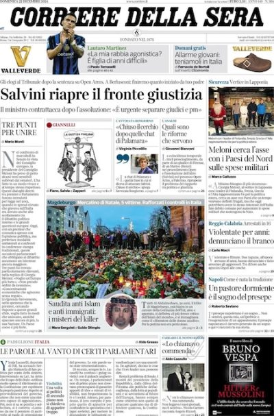 Gran parte dei giornali di oggi dedica ancora l’apertura alla sentenza del processo sul caso Open Arms, in cui il ministro dei Trasporti Matteo Salvini è stato assolto con formula piena. Trovano ancora spazio anche l’attacco al mercatino di Natale di Magdeburgo, in Germania, in cui sono morte cinque persone, e le informazioni sul presunto colpevole. Il Sole 24 Ore apre con un’analisi sulle principali novità della legge di bilancio, menzionate anche in altre prime pagine. Il Fatto Quotidiano ha un’inchiesta sui ritardi dei lavori per il Giubileo, a Roma.