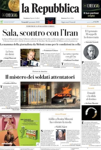 La notizia principale su tutti i giornali nazionali di oggi è ancora la detenzione in condizioni severe della giornalista Cecilia Sala in Iran: giovedì si è tenuta una riunione del governo italiano per discutere della vicenda, e nel pomeriggio la presidente del Consiglio Giorgia Meloni ha incontrato la madre di Sala. Ci sono poi ancora diversi articoli sia sull’attentato del primo gennaio a New Orleans, quando un uomo a bordo di un’auto ha investito la folla e ucciso 14 persone, sia sul Cybertruck di Tesla esploso vicino all’ingresso del Trump Hotel di Las Vegas (nel frattempo è stato identificato l’uomo a bordo dell’auto, morto nell’esplosione). Tra le altre notizie ci sono la morte della stilista Rosita Missoni e quella dell’ex calciatore e allenatore Aldo Agroppi, e l’Inter in finale di Supercoppa italiana.