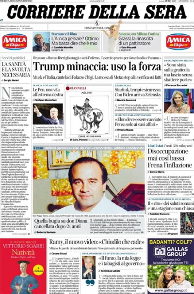 Mentre molti giornali di oggi si occupano in apertura della conferenza stampa del prossimo presidente degli Stati Uniti Donald Trump, durante la quale ha minacciato di intervenire militarmente per occupare la Groenlandia e il Canale di Panama, alcuni rimangono sulle discussioni sul possibile accordo fra il governo italiano e l’azienda di Elon Musk SpaceX per un sistema di sicurezza sulle telecomunicazioni del governo. Il Sole 24 Ore e il Manifesto titolano invece sulla decisione di Meta di abolire il sistema di fact checking su Facebook e Instagram, il Fatto e il Dubbio si occupano della riforma della giustizia, la Verità indaga sui finanziamenti al sindaco di Milano Sala, e Libero apre sulla campagna pubblicitaria per la serie tv su Mussolini tratta dal libro di Antonio Scurati.