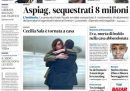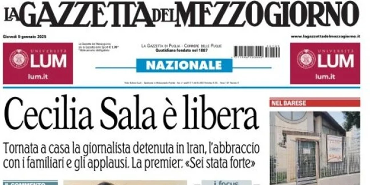 Su tutti i giornali di oggi l’apertura è dedicata alla liberazione e al rientro in Italia di Cecilia Sala, la giornalista arrestata circa venti giorni fa in Iran, accolta all’aeroporto di Ciampino a Roma dai familiari, dalla presidente del Consiglio Meloni e dal ministro degli Esteri Tajani. Le altre notizie principali sulle prime pagine sono gli incendi a Los Angeles, le indagini sulla morte di Ramy Elgaml a Milano dopo la diffusione dei video in cui si vede una macchina dei carabinieri investire la moto su cui viaggiava, la morte del giornalista sportivo Rino Tommasi, e le reazioni internazionali alle dichiarazioni in una conferenza stampa del prossimo presidente degli Stati Uniti Donald Trump.