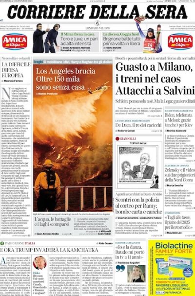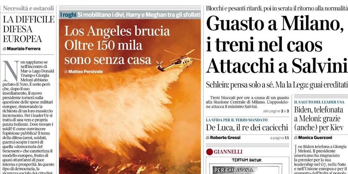 I principali quotidiani nazionali dedicano oggi molto spazio in prima pagina al guasto alla linea elettrica alla stazione di Milano Centrale, che sabato ha causato una lunga sospensione della circolazione dei treni. Il nome del ministro dei Trasporti e leader della Lega Matteo Salvini, attaccato dalle opposizioni, è in quasi tutti i titoli. Solo pochi giornali, presumibilmente quelli andati in stampa più tardi degli altri, riportano poi la notizia degli scontri a Roma al corteo per Ramy Elgaml, il 19enne di origine egiziana morto a Milano lo scorso 24 novembre durante un inseguimento dei carabinieri. Altro spazio su molte prime pagine è infine dedicato ancora ai devastanti incendi in corso a Los Angeles da cinque giorni.