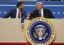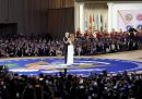 Dopo il giuramento e il primo discorso di Donald Trump da presidente degli Stati Uniti, la cerimonia di insediamento di lunedì 20 gennaio è proseguita con la parata che questa volta si è tenuta al chiuso dentro la Capital One Arena, il grande palazzetto che ospita normalmente le partite di NBA dei Washington Wizards, a causa del freddo. Di solito la parata di inaugurazione parte dall’edificio del Congresso, percorre Pennsylvania Avenue e arriva fino alla Casa Bianca. Alla Capital One Arena Trump ha parlato davanti ai suoi sostenitori e ha firmato alcuni dei numerosi ordini esecutivi firmati nel corso della giornata, cioè decreti presidenziali con effetto immediato. La cerimonia è poi proseguita con i tradizionali balli inaugurali, dove Trump tra le altre cose ha ballato sulla musica dei Village People agitando in aria una spada militare.