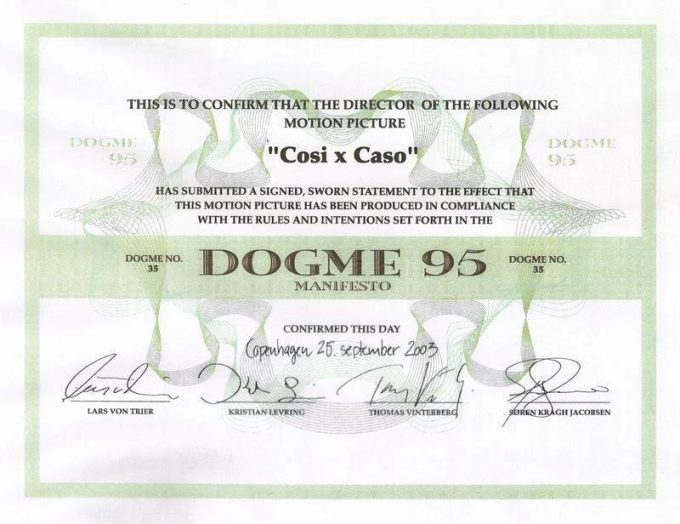 Cristiano Ceriello aveva immaginato e progettato il suo film, Così x caso, senza pensare al Dogma. Solo dopo averlo scritto e aver capito come poterlo finanziare e girare si rese conto che era già, bene o male, in linea con il manifesto, quindi non sarebbe stato difficile aderire a ognuno dei suoi dieci comandamenti. Decise così, insieme alla produzione, di cercare di ottenere la certificazione, ma si resero conto che erano arrivati tardi: le certificazioni erano state interrotte perché il movimento era stato dichiarato concluso. «C’erano un sito ufficiale e una mail ufficiale», spiega oggi Ceriello. «Sapevo che rispondevano a tutti e poi, benché parlassero tutti inglese, io in particolare avevo pure un amico danese. Di solito si faceva tutto tramite mail, ma quando ci risposero che il Dogma era stato chiuso con il film numero 34 decidemmo di andare lì e provare a convincerli».