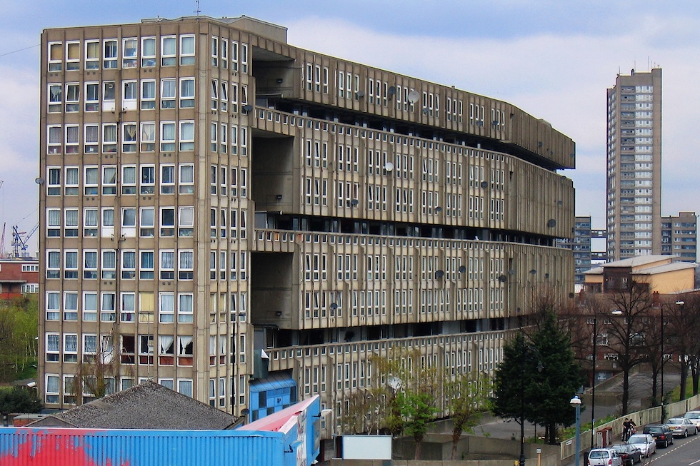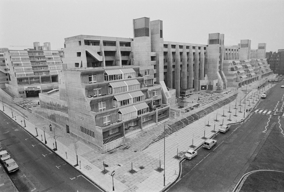 Il complesso residenziale dei Robin Hood Gardens di Londra, progettato alla fine degli anni Sessanta da Peter e Alison Smithson e completato nel 1972. La sua demolizione è cominciata nel 2017 per via di un progetto di riqualificazione della zona. La foto è del 2008. (Jim Dyson/ Getty Images)