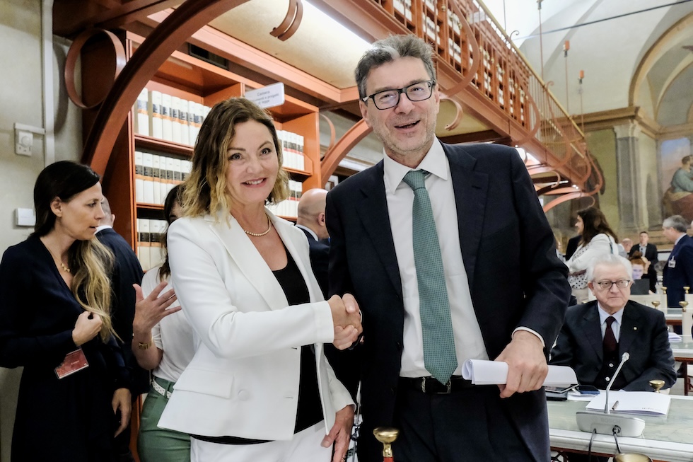 La presidente dell’UPB Lilia Cavallari insieme al ministro dell’Economia Giancarlo Giorgetti, alla Camera, il 18 giugno 2024 (Mauro Scrobogna/LaPresse)