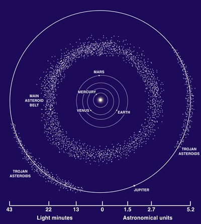 Rappresentazione schematica della fascia principale degli asteroidi, tra Marte e Giove (NASA)