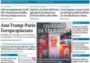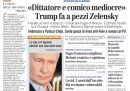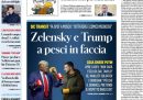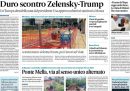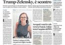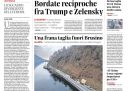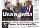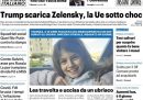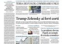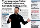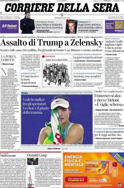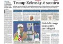 Su tutti i giornali di oggi l’apertura è dedicata allo scambio di accuse fra il presidente degli Stati Uniti Trump e quello ucraino Zelensky, dopo l’incontro fra le delegazioni statunitense e russa in Arabia Saudita per iniziare una trattativa su una tregua fra Russia e Ucraina: Trump ha accusato l’Ucraina di aver iniziato la guerra e ha definito Zelensky un dittatore, mentre Zelensky ha criticato l’adesione di Trump alla disinformazione russa. La Verità apre invece sull’esplosione che ha danneggiato la petroliera Seajewel a Savona, mentre i giornali sportivi commentano l’eliminazione della Juventus dalla Champions League maschile di calcio, dopo quelle di martedì di Atalanta e Milan.
