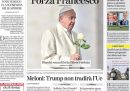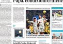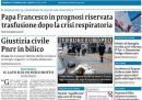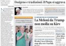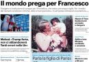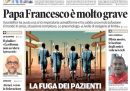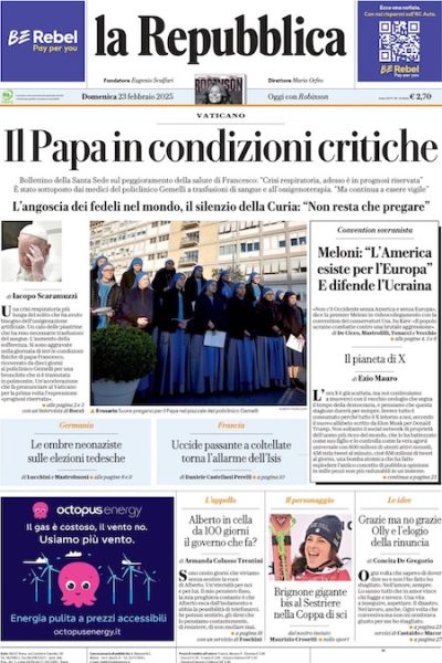 Quasi tutti i giornali hanno in prima pagina l’aggravamento delle condizioni di papa Francesco: sabato sera l’ufficio stampa del Vaticano ha fatto sapere che in mattinata il papa ha avuto una crisi respiratoria più grave rispetto a quelle dei giorni precedenti, e che le sue condizioni rimangono «critiche». Altre storie a cui viene dato spazio sulle prime pagine sono le elezioni federali, cioè nazionali, in Germania, e il fatto che la presidente del Consiglio Giorgia Meloni abbia mandato un videomessaggio al raduno dei conservatori a Washington, nonostante le polemiche sul saluto col braccio teso di Steve Bannon. I giornali sportivi hanno in prima pagina la vittoria del Torino contro il Milan e la vittoria dell’Inter contro il Genoa.