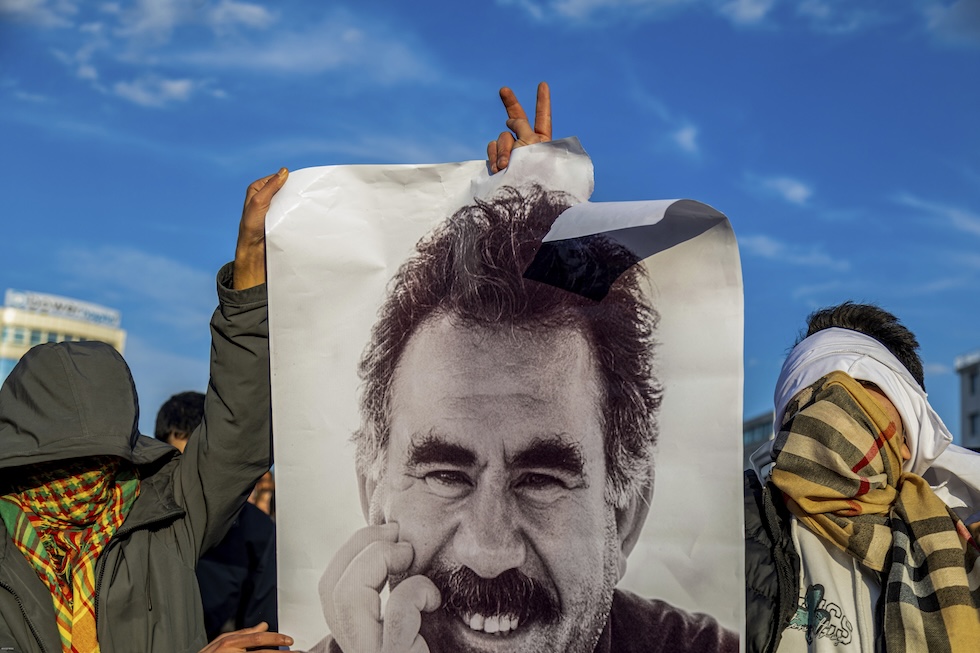 Un poster con l’immagine di Abdullah Öcalan in una manifestazione in Turchia (AP Photo/Metin Yoksu)