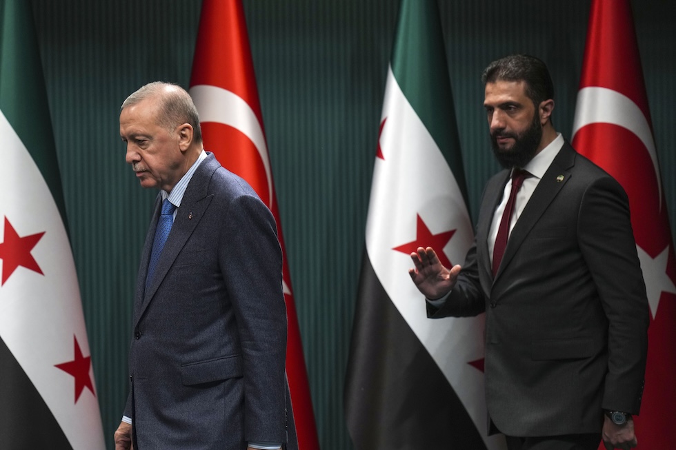Recep Tayyip Erdogan con il presidente siriano ad interim Ahmad al Sharaa nell’incontro di inizio febbraio (AP Photo/Francisco Seco)
