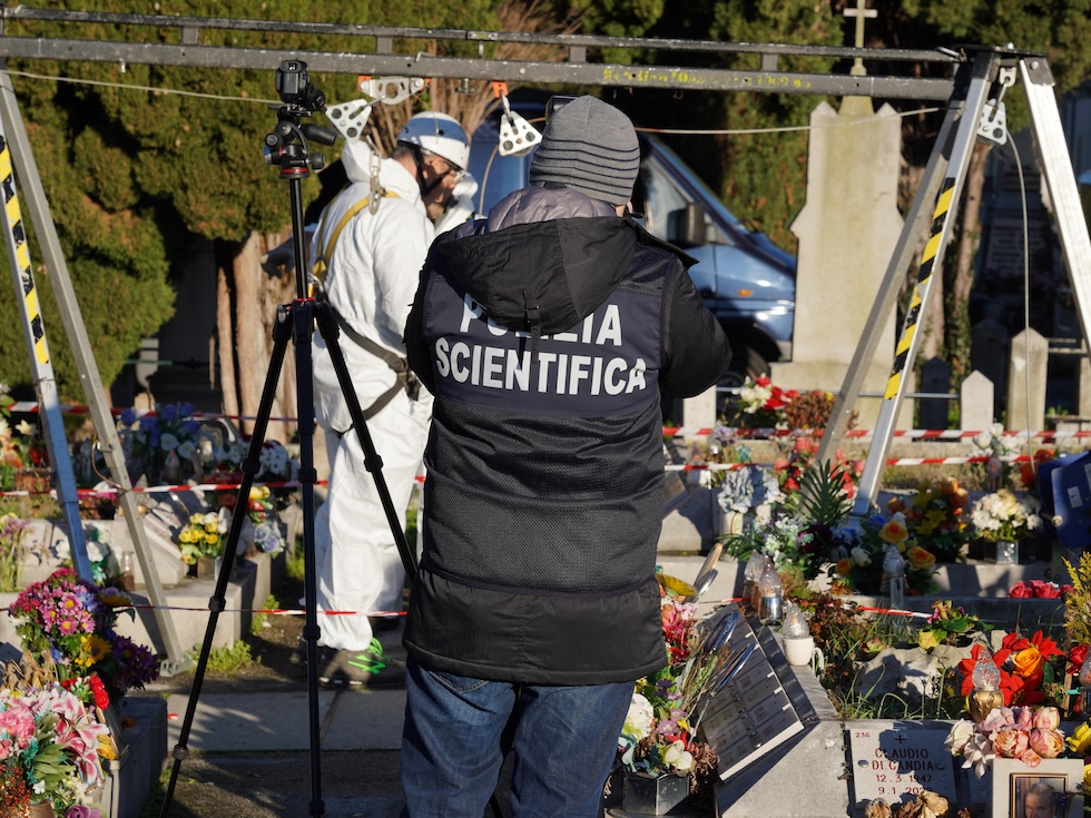 La polizia scientifica attorno alla tomba di Liliana Resinovich nel cimitero Sant’Anna di Trieste, 13 febbraio 2024 (ANSA/Mauro Zocchi)