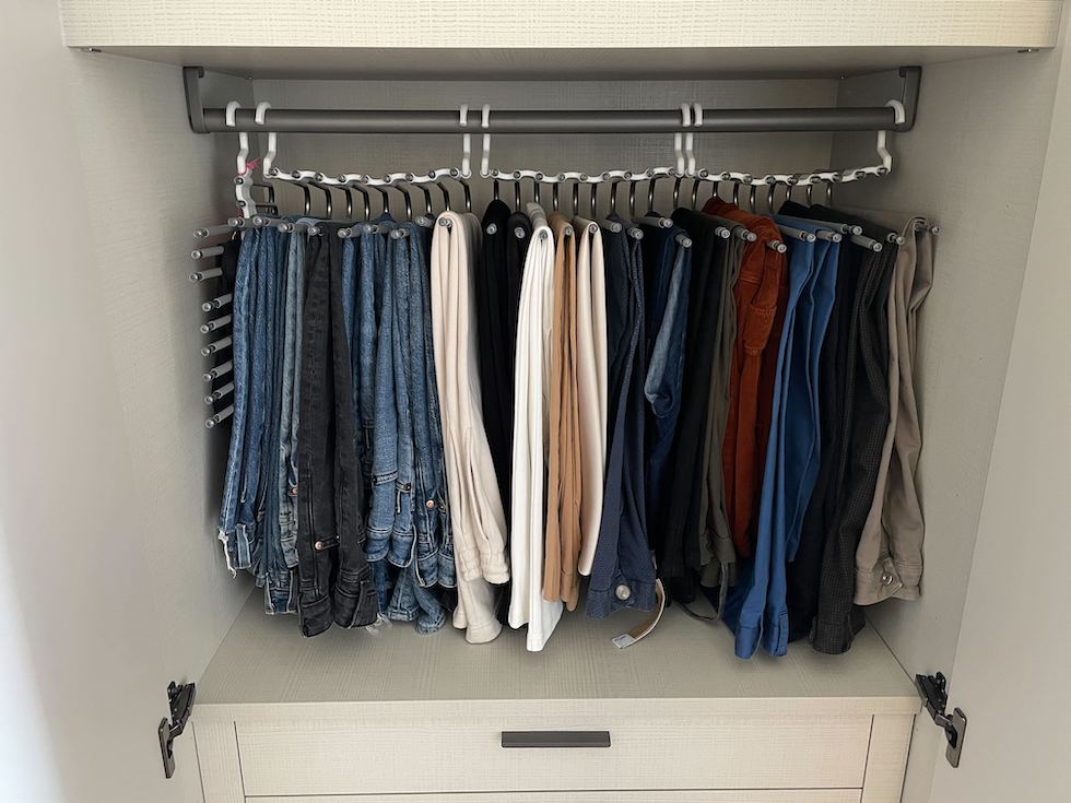 Usare grucce di materiali, forme e dimensioni diverse può creare ancora più confusione negli armadi, che sono già abbastanza complicati da tenere in ordine. Per ovviare al problema una persona del Post ha comprato su Amazon questi appendiabiti con nove astine sulle quali si possono disporre altrettante paia di pantaloni. Hanno due ganci alle estremità che permettono di appenderli sia in orizzontale (con entrambi i ganci) che in verticale (usandone solo uno) per risparmiare spazio. Una confezione da 18 euro ne contiene due. L’unica controindicazione, dice la persona che li ha comprati, è che «fanno sembrare una parte dell’armadio incredibilmente in ordine, e poi senti che tutto il resto deve raggiungere lo stesso grado di perfezione».