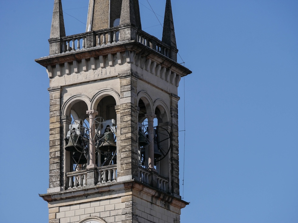 Le campane della chiesa di Chievo, ciascuna con la ruota che consente la rotazione a 360 gradi (Gianluca Cedolin/Il Post)
