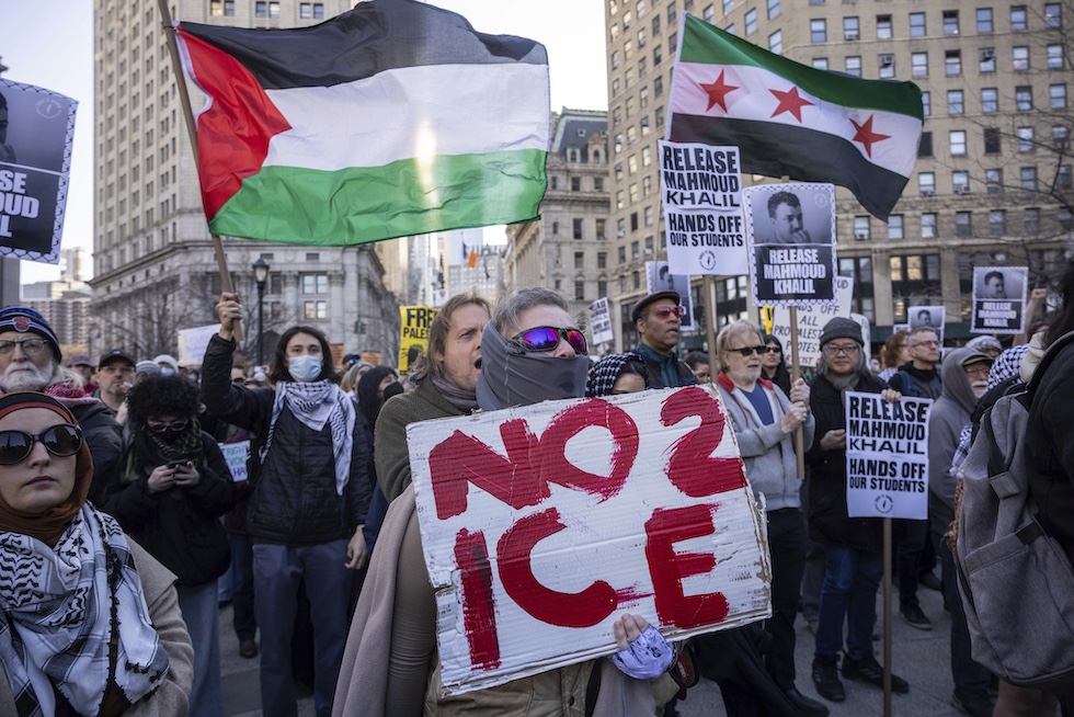 Una protesta dopo l’arresto di Khalil a New York, il 10 marzo 2025 (AP Photo/Yuki Iwamura)