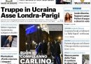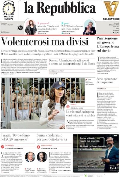 Sulle prime pagine dei giornali di oggi ha molto spazio la riunione dei leader dei paesi cosiddetti “volenterosi” che si è svolta ieri a Parigi per discutere di come sostenere l’Ucraina: la riunione si è conclusa di fatto solo con dichiarazioni di condanna alla Russia, ma senza un accordo sulla proposta di Francia e Regno Unito di inviare militari in territorio ucraino a svolgere missioni di peacekeeping in futuro. Tra le altre notizie si parla del sommergibile turistico affondato nel mar Rosso, in Egitto, in cui sono morte sei persone, della condanna dello scrittore franco-algerino Boualem Sansal in Algeria, dell‘arresto dell’ex presidente della provincia di Salerno Franco Alfieri, e della prima conferenza stampa di Igor Tudor da allenatore della Juventus.