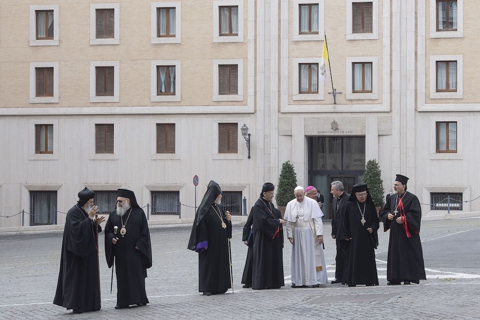Papa Francesco di fronte all’ingresso di Casa Santa Marta con i patriarchi orientali nella Giornata di riflessione e di preghiera per il Libano, 1 luglio 2021 (Vatican Media/LaPresse)