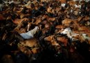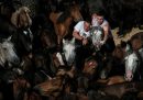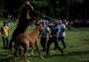 Gente del posto e visitatori aiutano a circondare le mandrie di cavalli selvatici prima di condurli al recinto dove saranno sverminati e tosati durante la “rapa das bestas”, Sabucedo, 5 luglio 2024. (REUTERS/Nacho Doce)