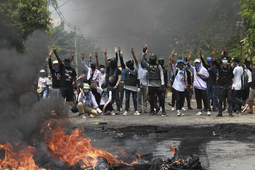 Un gruppo di manifestanti a Yangon durante le grosse proteste che seguirono il colpo di stato, 27 marzo 2021 (AP Photo)